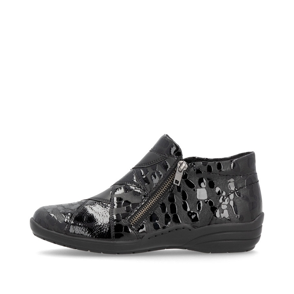 Pour se sentir libre, adopter Remonte !!! Remonte R7674 04 est une bottine femme en cuir vernir noir écaille de tortue. Cette bottine Remonte est facile à chausser grâce à ses doubles zip. Cette bottine Remonte est doté d'une semelle amovible matelassée. Parfaite pour accompagner vos tenues d'hiver. Hauteur de tige:7 cm Nous vous recommandons de choisir votre pointure pour les chaussures Remonte. Livraison rapide, chez-vous en 48h.
