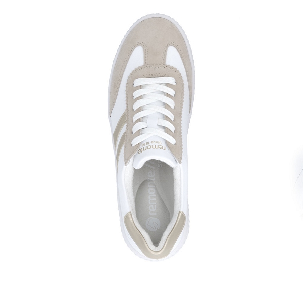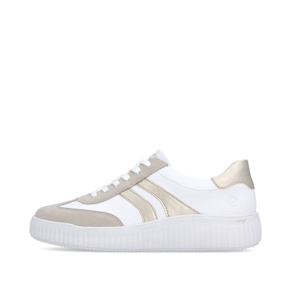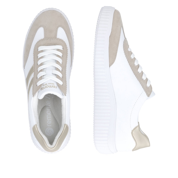 Pour se sentir libre, adopter Remonte !!! Remonte D3E00 80 est une tennis femme en cuir blanc ,beige et or. Cette chaussure basse à lacets habillera très bien votre pied. Idéale pour tous les jours grâce à une semelle intérieure amovible SoftFoam (mousse amortissante). Cette paire de chaussures est munie d'une voute plantaire pour plus de confort . Idéale pour le quotidien, cette chaussure s'adaptera parfaitement avec toute votre garde robe. Nous vous recommandons de choisir votre pointure pour les chaussures Remonte. Livraison rapide, chez-vous en 48h.